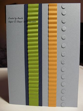 The next card uses no stamps at all. A sentiment can be added as required. Here the base is Bordering Blue. A strip of Night of Navy is then added, topped with a smaller strip of Old Olive which has been put through a crimper. More Mustard is then used for another strip through the crimper. I used a small hole punch for the Bordering Blue tiny circles which were adhered to the card with Glue Dots.