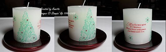 Really two topics in one. I finally got to try the candles after Tanya’s tutorial with me. My sister Helen, and I made this one using the Snow Swirled stamp set, with Glorious Green and Real Red inks. I am very pleased with the way it has turned out. I have taken a few photos around the candle and combined them into one so that you can see all sides.