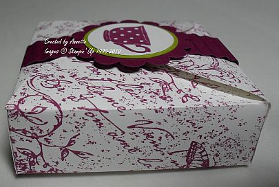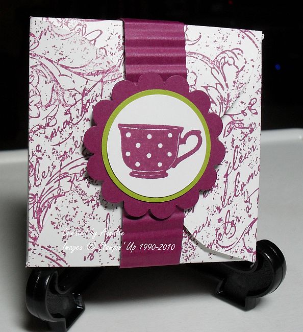 As a special thank you for participating, I sent my friends and customers who donated or attended this thank you card. It could be considered to be a ‘clean and simple’ card. I started by using the Perfect Polka Dots Embossing Folder on a piece of Elegant Eggplant. I then took some Very Vanilla cardstock and rolled it with Very Vintage Jumbo Roller in Elegant Eggplant ink. A small piece of the polka dots was place across the middle of the card, then Thanks So Much from Sincere Salutations, and Share a Cup were stamped in Elegant Eggplant. I thought the cup was very appropriate for the event.