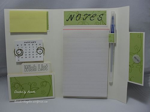 sticky notes, monthly calendars, wish list sheets, and a notepad.