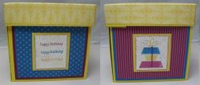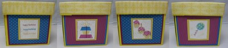 An interesting concept, again from UStamp With Dawn and Friends. When you take the lid off the box, it ‘explodes’ or falls open. The idea is to attach small gifts to the inside of the box.