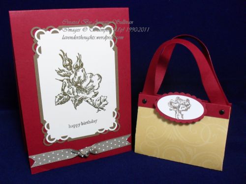 I did promise there would be more with my new favourite stamps – Happiness Shared. Here I have gold embossed the flower on Very Vanilla, mounted it on Soft Suede and Cherry Cobbler. A very regal combination.