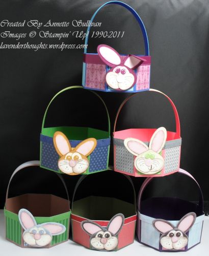 Belated Happy Easter to all. Here are the Easter Baskets I made thanks to Tracey Old’s project in the UStamp With Dawn and Friends Big Shot Brilliance event. The cute little bunny faces are thanks to Kay. The baskets were totally full of eggs on Easter Sunday, but this photograph was taken before the straw and eggs were added. Needless to say, everyone loved their gifts.