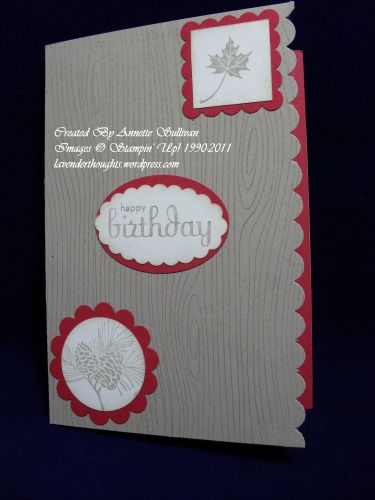 Here is the first of my cards for the gift box I showed you yesterday. I used the Scallop Border Punch on the front of the card, and then put a small strip of Riding Hood Red on the inside. You can just see it in the photo.
