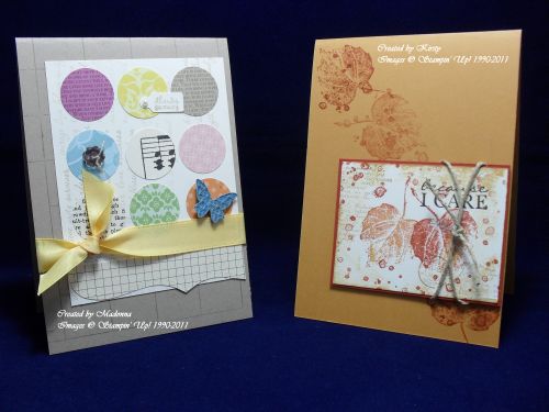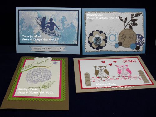 Last weekend, Madonna held a team meeting with a shoe box swap theme. Everyone had a great time making each other’s cards. I got some great new ideas for sketches, colours, techniques, and stamps. Thanks to Madonna, Michelle, Megan, Mandy, Kaylene, Kirsty, Ann MD, Anne E, Anne V, and Heather for a terrific day.