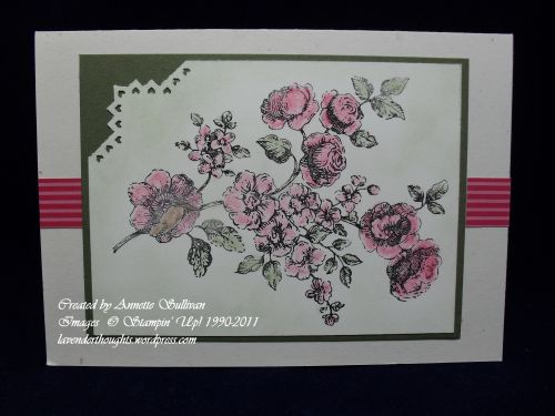 I’m back again with my favourite Elements of Style stamp set. This time, I have coloured the image with Rose Red and Always Artichoke Pastels, then sponged the background lightly with the Artichoke. To complete the picture, I punched the top left corner with the Pinking Hearts Corner Punch, layered it with Artichoke, with a small piece of striped Rose Red DSP across the middle. The card base is Confetti White.