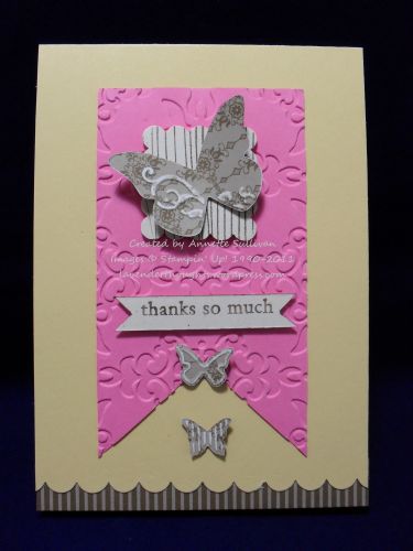 I am still caseing the current IBC. Today, it is from page 71. Using different colours certainly gives another look to the design. I added some extra dimension to the butterflies by sanding the embossed parts.
