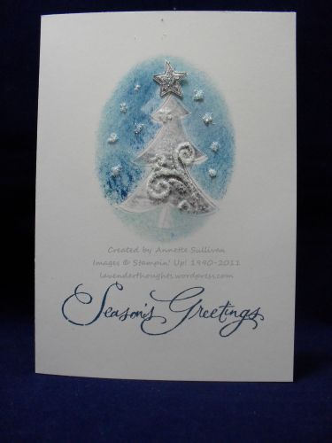 On Whisper White cardstock, I sponged an oval shape using Baja Breeze, Not Quite Navy and Night of Navy inks with a mask over the space for the Christmas tree. I then inked the tree from Season of Joy with Basic Gray and stamped it off twice before placing it slightly off from the masked tree space. This gives a three dimensional effect.