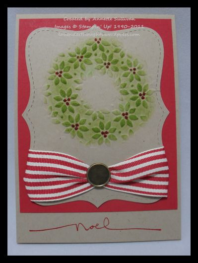 I used a Crumb Cake top note as the embossing surface, and sponged Old Olive on the petals of the wreath. A Riding Hood Red marker was then used on the berries. A piece of 1¼” striped grosgrain ribbon was placed across the bottom of the top note with a build a brad in the middle to create a bow like effect. This was matted on a piece of Riding Hood Red and placed on a Crumb Cake card. The sentiment from Many Merry Messages was then stamped in Riding Hood Red.