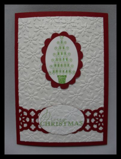 Once again, I have used Iridescent Ice embossing powder on the tree. I created a frame for the tree by cutting Cherry Cobbler with the scallop border punch. I then snipped between each scallop so that it would fold around the oval. A ready made scalloped frame to suit any shape you want. As a final touch, I used the new lace ribbon border punch (thanks for the loan Sue).