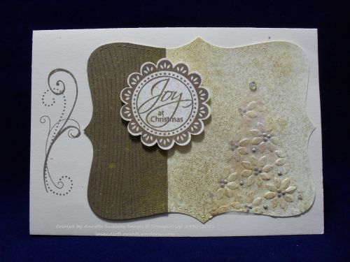 I used pieces of Very Vanilla and Soft Suede through the Top Note Die. Using partial embossing with the Very Vanilla Top Note and the Petals-a-Plenty embossing folder, I created a Christmas tree. The berries were coloured with a Soft Suede marker and a rhinestone added to the top of the tree. I then cut the Soft Suede Top Note and stamped Woodgrain on the smaller piece. This was then attached to the Vanilla piece and sprayed with Gold Glow Smooch Spritz. When dry, I took a sponge dauber with some Frost White Shimmer Paint and sponged the tree.