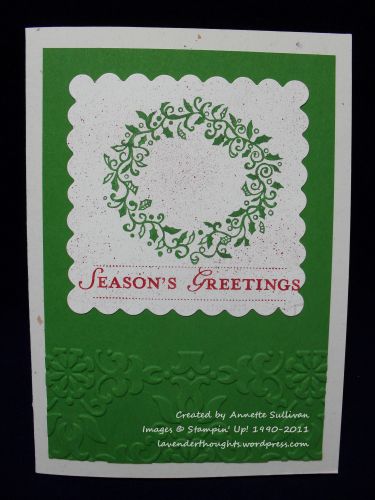 Back again with another from the Welcome Christmas set. Today, I have used part of the large sentiment and the wreath on a scallop square. This was then lightly spritzed with Real Red. The Garden Green background has the lower part embossed with the Vintage Wallpaper EF.
