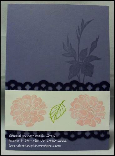 I stamped the leaf image with Versamark onto the Wisteria Wonder cardstock. On a piece of Whisper White, the solid floral image was stamped with Pink Pirouette and the leaf with Lucky Limeade. Concord Crush was used in the Lace Border Punch. This was then cut in half and added behind the top and bottom of the Whisper White piece before adhering to the Wisteria Wonder. I have left the sentiment blank for now.