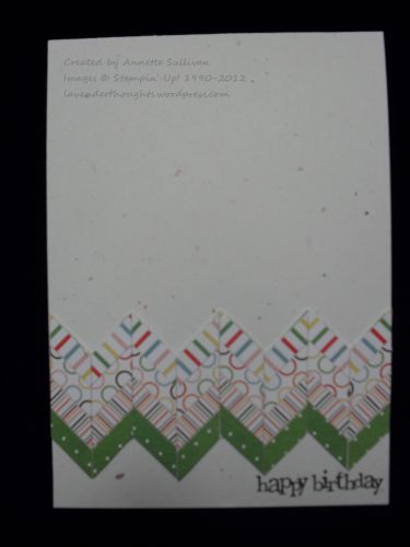 Here is a great idea I picked up as extra inspiration for CAS cards. This technique uses small pieces of DSP to create a chevron border effect. A very useful addition for the most CAS of cards.