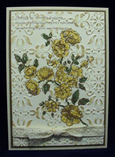 This time we stamped the roses from Elements of Style in Soft Suede ink on Very Vanilla card stock. Daffodil Delight and Always Artichoke were used to colour the image which was then run through the Vintage Wallpaper EF and highlighted with Tea Stain Distressing Ink. After adding piece of Chantilly Lace across the bottom of the panel, it was layered on Soft Suede on a Naturals Ivory card base.