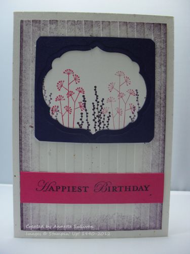 This is the Color Challenge this week at Splitcoaststampers. Colours to be used are Elegant Eggplant, Concord Crush, Melon Mambo with an optional extra in the challenge to use stripes.