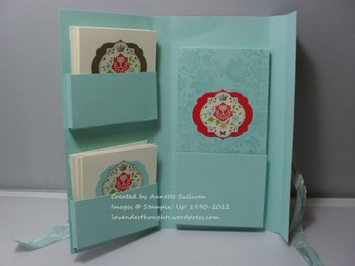 When you open it up, you can see pockets on the left and right. The pockets on left contain note cards and envelopes, and the pocket on the right contains a decorated notebook. Check back over the next few days to see how I made the note cards, envelopes and notebook.