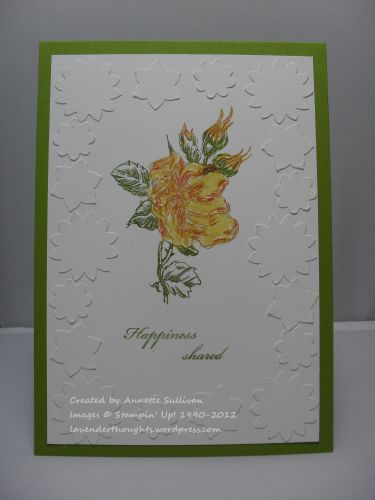 My base card is Old Olive and I have coloured the rose from Happiness Shared with Old Olive, Tangerine Tango and Daffodil Delight markers and stamped on Whisper White. The faux dry embossing technique involves cutting/punching images in the same colour as the card stock and attaching them. By using the same colour, you get the faux embossed look. I used the Boho Blossom punch for my punched flowers.