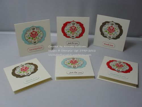 The cards have been made with Very Vanilla card stock. They are approximately 6.7cm (2-5/8″) square when closed. I then used Soft Suede, Poppy Parade and Pool Party card stock and Everyday Enchantment DSP with the Labels Framelits to create the card fronts. Sentiments from Teeny Tiny Sentiments were stamped in matching colours and punched with the Word Window Punch, sponged around the edges and adhered to the card.