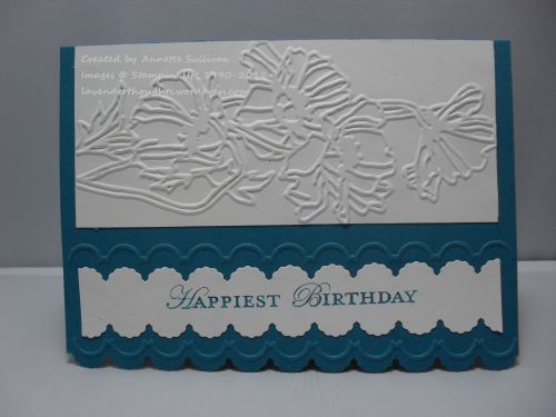 I have used a base card of Island Indigo. The edge has been cut with the Adorning Accents Scallop Edgelits die and then embossed with the matching EF. The EF was used again a little way in. The Flower Garden EF was embossed on Whisper White, whilst another piece of Whisper White was cut on both sides with the same Edgelits die. The sentiment from Apothecary Art was stamped with Island Indigo.
