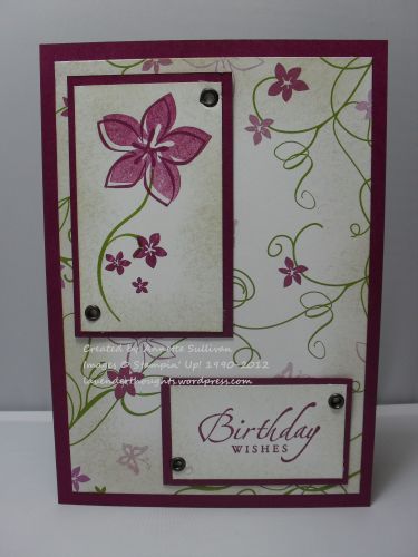 I went back to a sketch that was one of my favourites when I first started stamping, dug out some eyelets [not SU] which were all the go then, and some retired DSP. My base card stock is Rich Razzleberry, with Cottage Wall DSP and Whisper White layers. The edges of the DSP and White have been sponged with Crumb Cake. Images are stamped in Old Olive and Rich Razzleberry and are from Cottage Garden and Sincere Salutations. I had a little fun with the Cropadile trying to remember how to set the eyelets, but they ended up looking ok.
