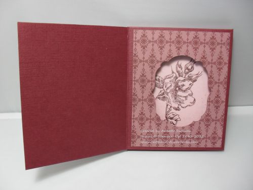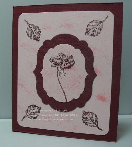 The inside layer is Bravo Burgundy DSP and the ‘box’ aperture is acetate. The layer under the acetate is Pink Pirouette. The background image is also from Happiness Shared, inked with Bravo Burgundy and spritzed with Pink Pirouette.