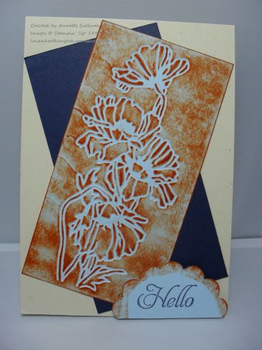 My base card is Naturals Ivory and the two panels are Night of Navy and Bashful Blue. The Bashful Blue layer was put through the Flower Garden EF and then the negative side [the debossed side] was covered with Pumpkin Pie ink using the direct to paper method. This highlights the embossed or should I say, debossed image very well. I then punched a 2-3/8″ Scallop Circle from Bashful Blue, cut it in half, sponged the scalloped edges with Pumpkin Pie and stamped the sentiment from Elementary Elegance in Night of Navy. This was then added to the bottom right hand corner of the card with dimensionals.