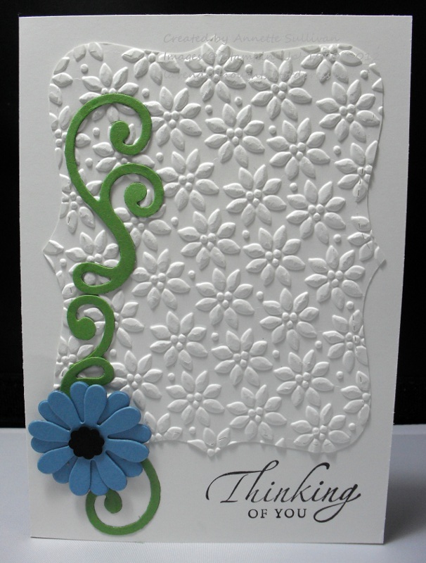 Back again with another CAS card using the white on white layer challenge. This time I have combined it with this week’s Sketch Challenge on Splitcoaststampers. The sketch called for a flourish down the left hand side, so I used my Scribbles Swirls Sizzlit and cut out 2 of them in Wild Wasabi. I then used one of the smaller flowers from the Blossom Party die and cut 2 of them in Marina Mist. To complete the flower, I punched out the flower from the Itty Bitty Shapes Punch Pack in Basic Black. The white layer was cut with the Top Note and put through the Petals-a-Plenty EF. The sentiment is from Sincere Salutations and is stamped in Basic Black.