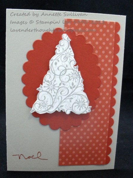 I used Sahara Sand for the card base and Cajun Craze for the other colour. The tree image from Snow Swirled was stamped in Sahara Sand on Whisper White and fussy cut. This was layered onto a scallop oval and overlaid on a piece of Cajun Craze DSP. The scallop border punch created some added interest on cardstock down the side of the DSP. The sentiment is from Many Merry Messages.