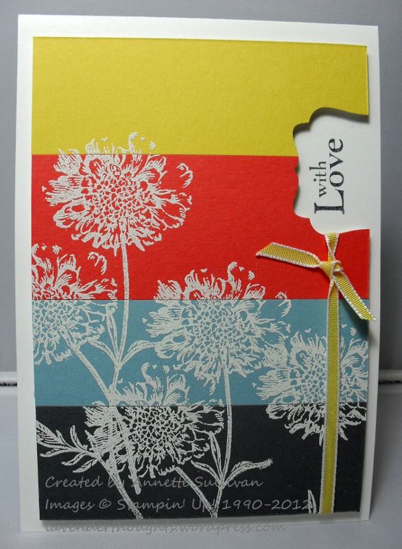 The next make and take was by Kirsty. The card base is Whisper White and the layers are Basic Gray, Baja Breeze, Calypso Coral and Daffodil Delight. Images from Field Flowers were stamped in Versamark and heat embossed with White Embossing Powder. The Decorative Label Punch created a shape to highlight the sentiment on the base card. The embossed layer was attached with dimensionals. Thanks Kirsty for more great inspiration.