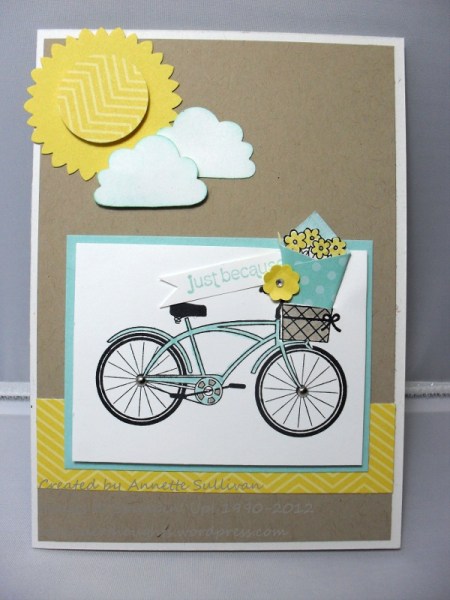 The final make and take was by Madonna who used the Pedal Presents Hostess set from the mini Catalogue (which finishes on 31 July). This gorgeous card uses Confetti White for the base. The main layer is Crumb Cake, with pieces of Pool Party, Daffodil Delight, Whisper White, Pool Party DSP, and the Daffodil Delight DSP which comes from the Party Animals Simply Scrappin’ Kit. Silver mini brads were used in the centre of the wheels. The sun was double punched with the 1-3/4″ Scallop Circle Punch, the centre of the sun was punched with the 1″ Circle Punch, the clouds with the Cupcake Builder Punch, and the little flower with the Scallop shape from the Itty Bitty Shapes Punch Pack. Thank you Madonna for a great card and a wonderful day.