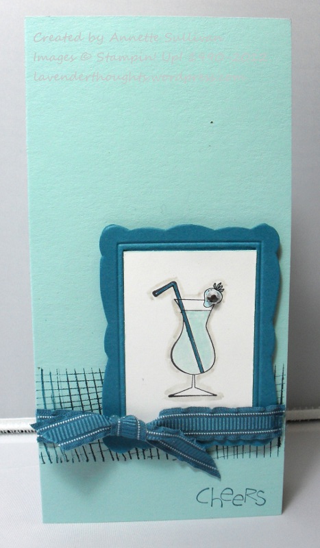 I used the rectangular Designer Frames EF, a rhinestone and some Island Indigo Ruffled Ribbon to complete the picture. The net look in the background was created with the Woodgrain background stamp, first stamping in one direction and then stamping at right angles.