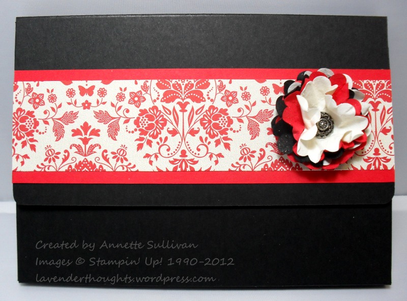 I have made a card purse which will hold 4 cards and envelopes. An elegant little gift for any occasion. The purse is Basic Black and the layers are Poppy Parade and Everyday Enchantment DSP. I made the flower from Basic Black, Poppy Parade and Very Vanilla card stock, punching out one of each using the 1-3/4″ Circle Scallop Punch. I broke up the fibres in each piece and separated them. They were then crunched up and opened. I layered them and added an Antique Brad to hold the layers together. A quick spray of Champagne Shimmer Mist to add sparkle, then the finished flower was attached to the purse with Crystal Effects.