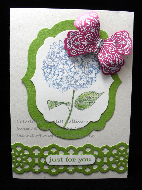 I stamped one of the images in Versamark on Rose Red and heat embossed it using White EP. It was then punched out with the Blossom punch, and two of the petals cut away to form a butterfly. I curled the wings with a bone folder, and added some rhinestone jewels. For the card, the base is Naturals Ivory with layers of Old Olive and Very Vanilla. The pretty flower image from Because I Care was stamped with Marina Mist and Old Olive on Very Vanilla. This was then cut with a Labels Framelit. The next size Labels Framelit was used to cut an Old Olive Layer. The Lace Ribbon Border Punch creates the background for the sentiment from Just Believe which was punched out with the Word Window Punch., The pretty butterfly was added with a dimensional