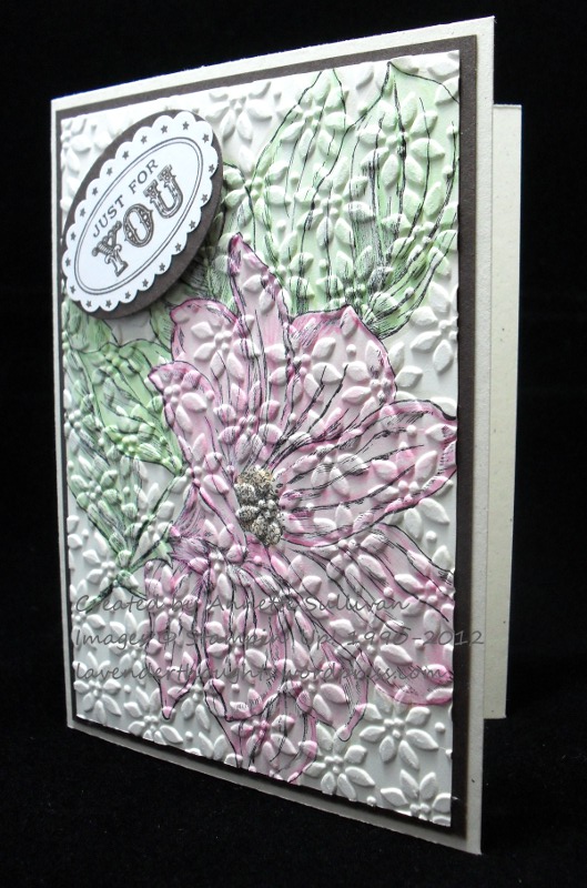 This time I tried Very Vanilla card stock and an old favourite retired stamp, From the Garden. I used Wild Wasabi and Certainly Celery for the leaves, and Melon Mambo, Pink Pirouette and Pumpkin Pie for the flower. The sentiment is in Early Espresso and is from Oval All, punched out with the Scallop Oval Punch, and layered with the Wide Oval Punch. I embossed the watercolour layer with the Petals-a-Plenty EF, layered onto Early Espresso and the base is Naturals Ivory.
