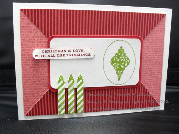 The card base is Whisper White with layers of Cherry Cobbler DSP and Riding Hood Red DSP. The next layer is Cherry Cobbler card stock cut with the Corner Rounder punch, and the top layer, also cut with the corner rounder punch has an ornament from Tree Trimmings inked in Old Olive. The three decorations along the bottom were cut from another ornament from the Tree Trimmings set. The sentiment from Contempo Christmas is stamped in Cherry Cobbler and punched with the Word Window Punch.