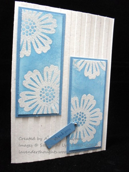 This is another example of Emboss Resist. The base card uses Confetti White which has been put through the Stripes Embossing Folder. The panels were stamped with Versamark on Whisper White and heat embossed with Iridescent Ice Embossing Powder and then sponged with Marina Mist ink, and layered on Marina Mist card stock. The sentiment from Teeny Tiny Sentiments has been punched with the Word Window Punch and then the Jewellery Tag punch and attached with a mini brad.