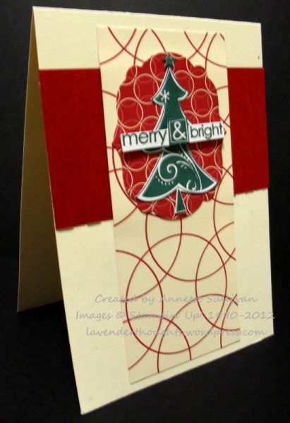 I used a card base of Confetti Cream, a layer of Cherry Cobbler which was embossed with the Stripes EF, and Jolly Holiday DSP. The image and sentiment were stamped with Handsome Hunter [retired] on Whisper White and adhered to a piece of DSP which was cut with a Labels Framelit.