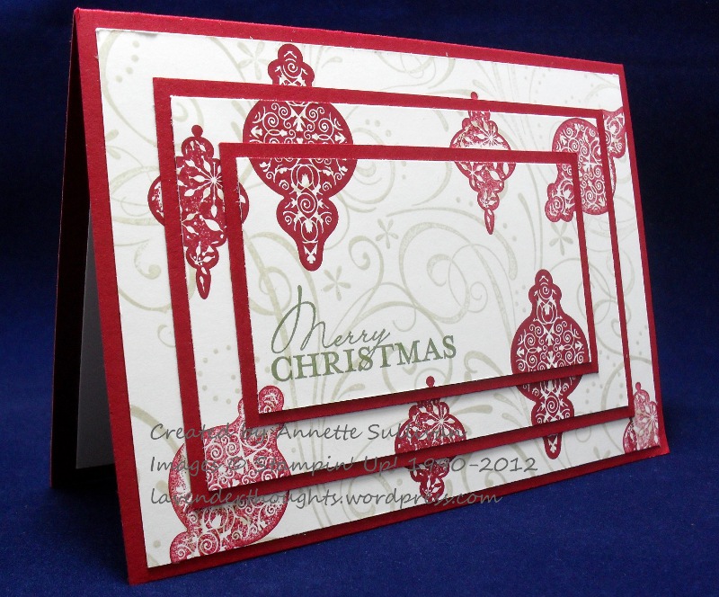 I have used the Triple Time stamping technique again. This time it is a Christmas card. The card stock is Cherry Cobbler and Whisper White. Stamps used are Tree Trimmings, So Swirly and Contempo Christmas and ink is Sahara Sand, Cherry Cobbler and Always Artichoke.