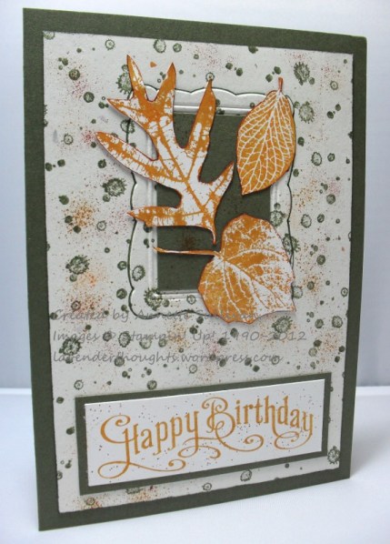 For this one, I have used Always Artichoke for the base card stock. I took a piece of Confetti White and stamped it in Always Artichoke with the water spots image from French Foliage. It was then embossed with the rectangle Designer Frames EF, and a piece of Always Artichoke placed in the middle of the frame. I then traced the outline of the frame using an Artichoke marker. The leaves from French Foliage were inked with More Mustard and stamped on Whisper White. These were then fussy cut and added across the Designer Frame. The sentiment is from Perfectly Penned, stamped in Mustard on Whisper White. After layering it on Artichoke, it was added to the card and the whole card was spritzed with Pumpkin Pie and Cajun Craze.