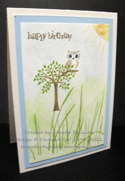 For this Dare to Get Dirty Splitcoaststampers challenge, I found this cute little retired set in the cupboard. I stamped the tree and the owl from Forest Friends on a piece of Whisper White using Soft Suede and Old Olive. I then added the grass from Inspired by Nature and sponged some Certainly Celery and Bashful Blue to represent the ground and sky. Using the negative part from a circle punch, I created a mask and added the sun with Daffodil Delight. The sentiment is from Party This Way. This was layered onto Bashful Blue and the base card stock of Confetti White.