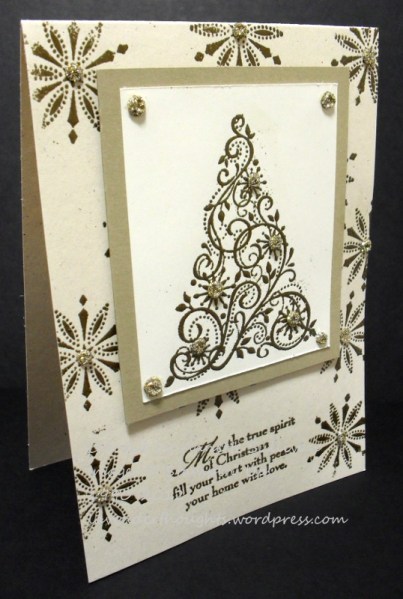 It uses Naturals Ivory, Brushed Gold and Very Vanilla. The images from Snow Swirled were stamped in Versamark and heat embossed with Gold Embossing Powder. I then ‘blinged’ it up with my home made bling using Crystal Effects and Gold Glitter. Not easy to see all the sparkle here, but you can imagine it IRL.