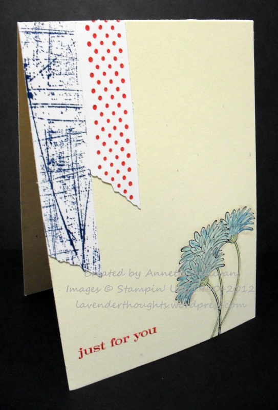 For this DTGD challenge, my card base is Confetti Cream, and my faux washi tape is made on Whisper White card stock as I didn’t have any tape. I stamped the Sanded background in Not Quite Navy, and the Builder Wheel Pleasing Polka Dots in Riding Hood Red. These pieces were cut on an angle using a pair of fancy scissors. The flowers are from Reason to Smile, and were stamped in Stazon Jet Black and watercoloured with a Blender Pen, Not Quite Navy, Old Olive and Crumb Cake inks. Just Believe set provided the sentiment which was stamped in Riding Hood Red.