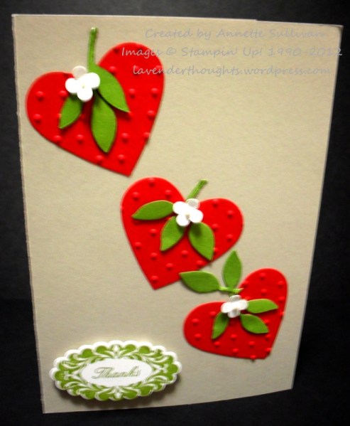 I made these cute little strawberries using the Large Heart Punch, Perfect Polka Dots EF, Itty Bitty Shapes Punch Pack,Sizzlits Little Leaves and Basic Jewel Pearls. The sentiment is from Perfect Punches, cut with the Scallop Oval Punch. It was all put together on a card base of Sahara Sand.