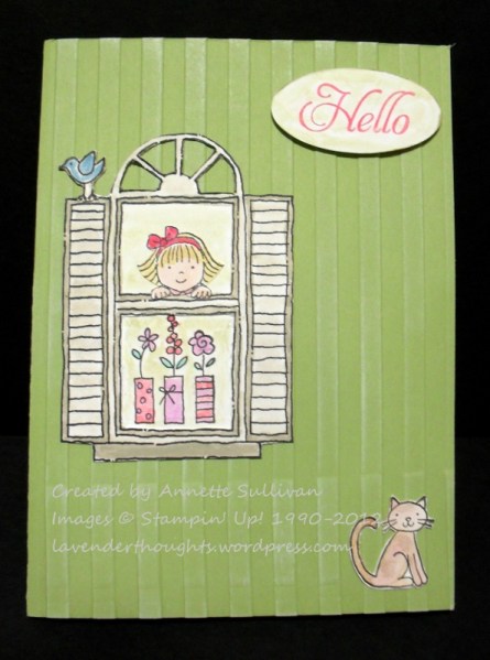The base card of Pear Pizzazz has been embossed with the Stripes EF and swiped with the Stazon Cotton White ink. The Window Dressing images were fussy cut and coloured with a Blender Pen and various inks. The sentiment from Elementary Elegance was stamped in Melon Mambo on Whisper White, colour washed with a Blender Pen and River Rock ink, cut with the Large Oval Punch and added to the card with dimensionals.