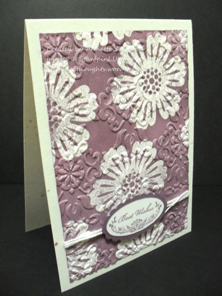 I had a piece left over from a previous emboss resist. I sponged Perfect Plum over the entire piece and wiped off the excess ink with paper towel. This piece was then embossed with the Vintage Wallpaper EF, wrapped a few times with some White Baker’s Twine and attached to a Confetti White base. A sentiment from Oval All was stamped with Perfect Plum on Whisper White. This was cut with the Large Oval Punch and layered on Perfect Plum cut with the Scallop Oval Punch.