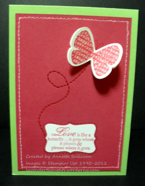 This one uses it around the Rose Red layer, around the Decorative Label punched sentiment and as a trail for the butterfly. Both the butterfly and sentiment are from Butterfly Prints, stamped in Rose Red. The base card is Certainly Celery.
