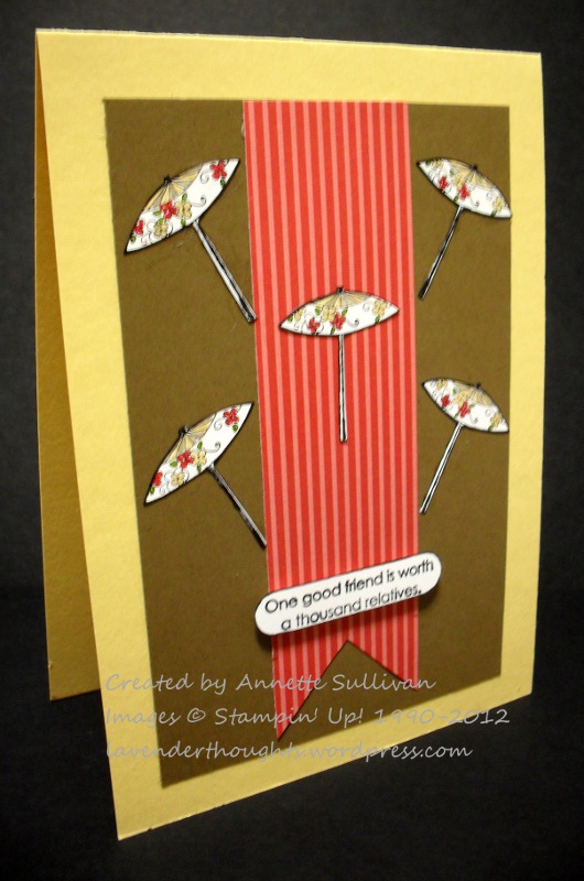 I took the umbrella image from Kimono Kids and stamped it in Basic Black on Whisper White. Colour was added with Riding Hood Red, Crumb Cake, So Saffron and Old Olive markers. The umbrellas were then fussy cut. The base card of So Saffron was layered with Soft Suede and a strip of striped Riding Hood Red DSP. The umbrellas were then added. The sentiment from the same set was stamped in Basic Black, cut with the Word Window Punch and added with Dimensionals.