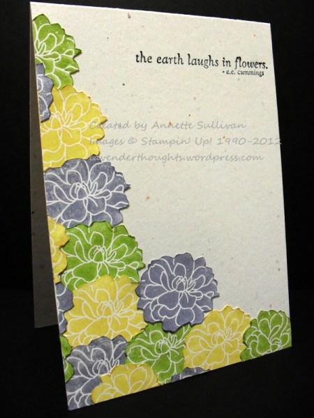 I stamped multiple copies of one of the flower images from Fabulous Florets in Lucky Limeade, Daffodil Delight and Wisteria Wonder. These were then fussy cut and arranged on a base of Confetti White. Then the sentiment from the same set was stamped on the base in Basic Black.