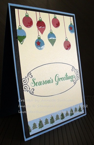 I started with a base of Marina Mist and layered it with Basic Black. Using the ornaments and trees from the Snow Festival Countdown Embellishments and the Filigree Oval and Seasons Greetings stamp brushes from Candlelight Christmas Ensemble on the Remember December Digital Collection disc, I created a layer on a Very Vanilla background, printed it out and added to the card. Crystal Effects was used on parts of the ornaments and trees to add some texture.